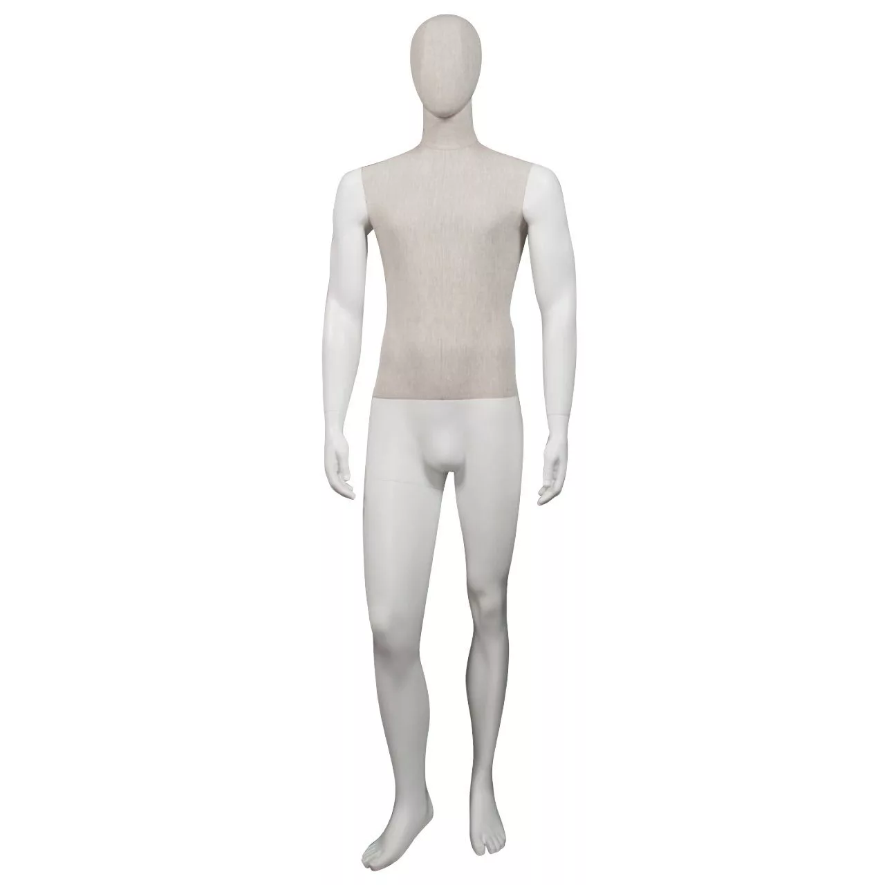 • The Marco male mannequin combines a linen fabric torso with fibreglass arms and lower body, making it an ideal choice for premium retail and boutique displays. Its abstract head provides a modern, versatile look that complements all types of apparel, from casualwear to tailored fashion.