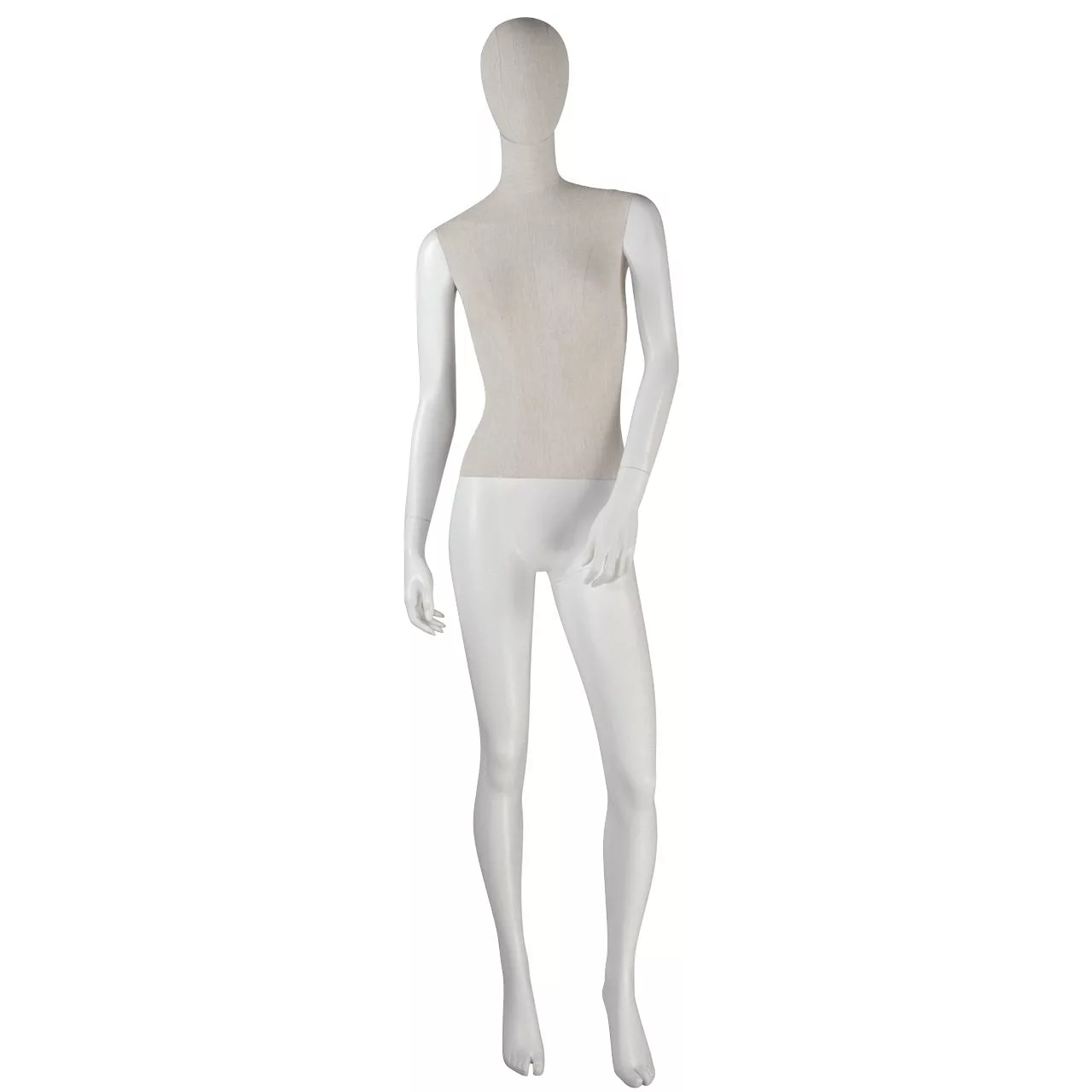 - Female mannequin with linen fabric torso and fibreglass arms/lower body
