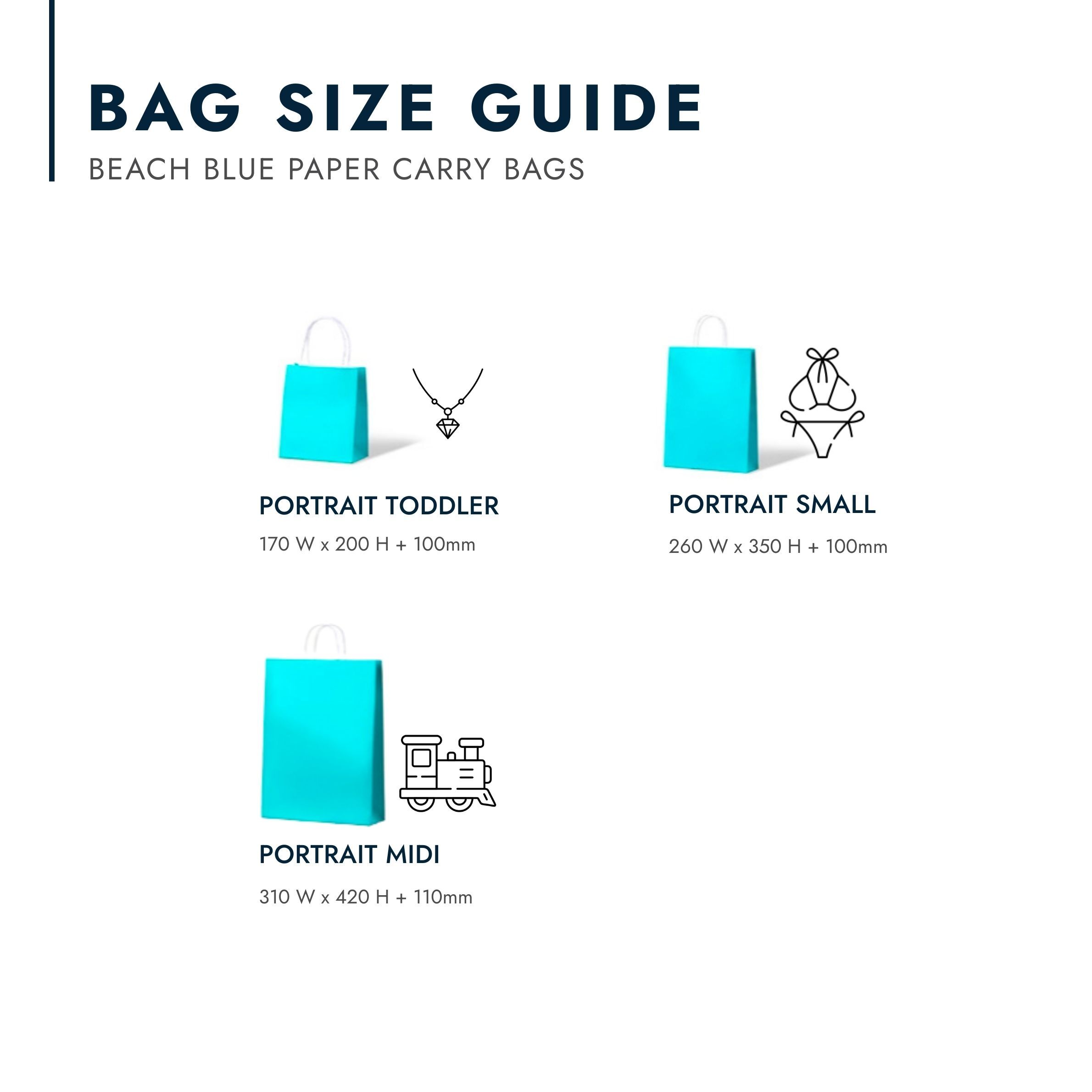 Beach Blue paper carry bags made from durable 110gsm responsibly sourced kraft paper. Available in three sizes and packed 250 per carton, with reinforced twisted paper handles.