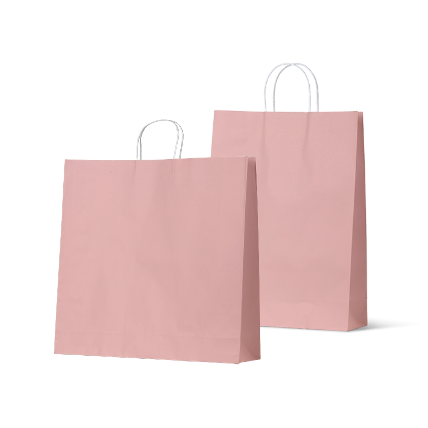 Dusty Pink paper carry bags made from premium 140gsm kraft paper with 40% post-consumer recycled content. Featuring reinforced J-style twisted handles for a durable and sustainable retail packaging solution.