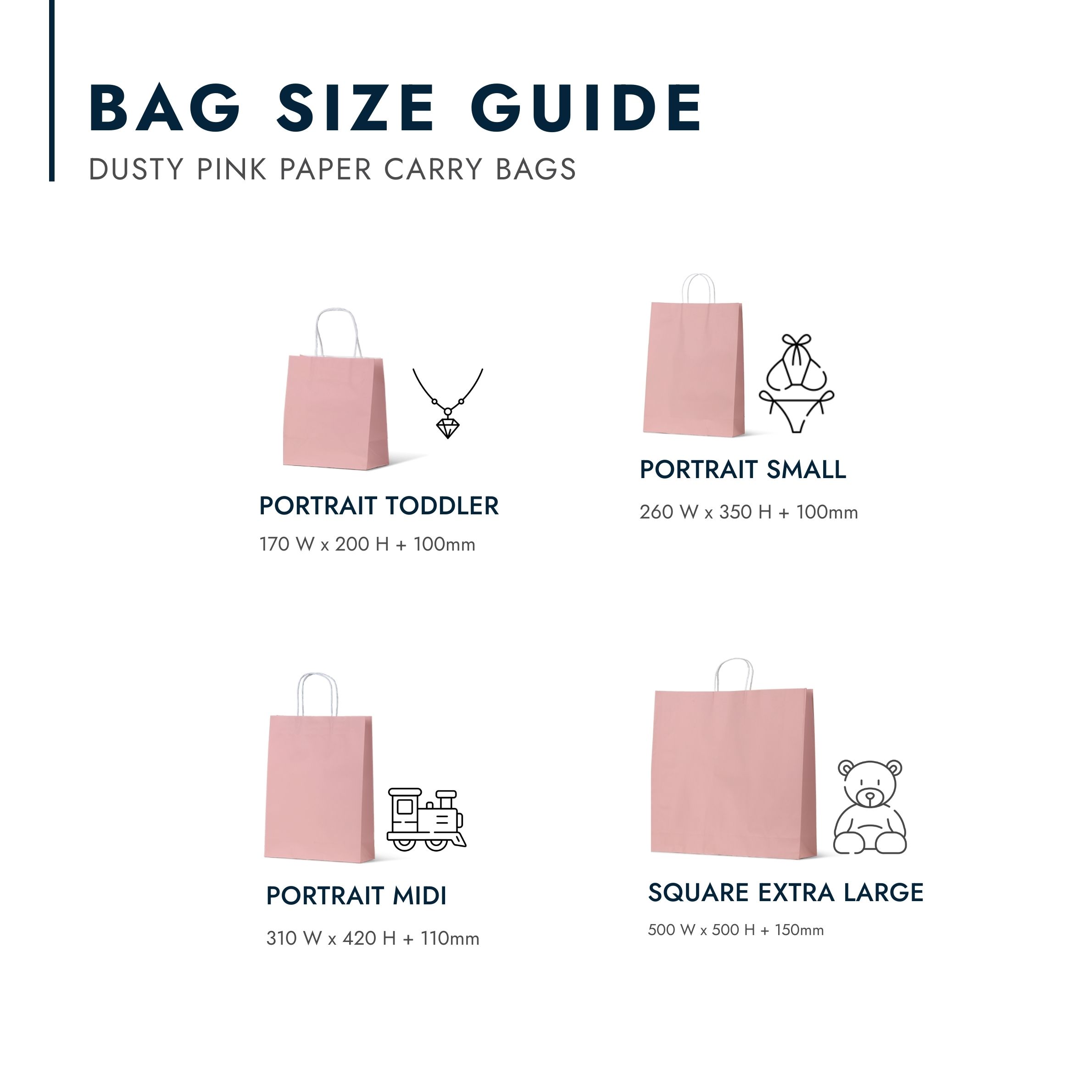 - Portrait Midi: 310mm (W) x 420mm (H) + 110mm gusset