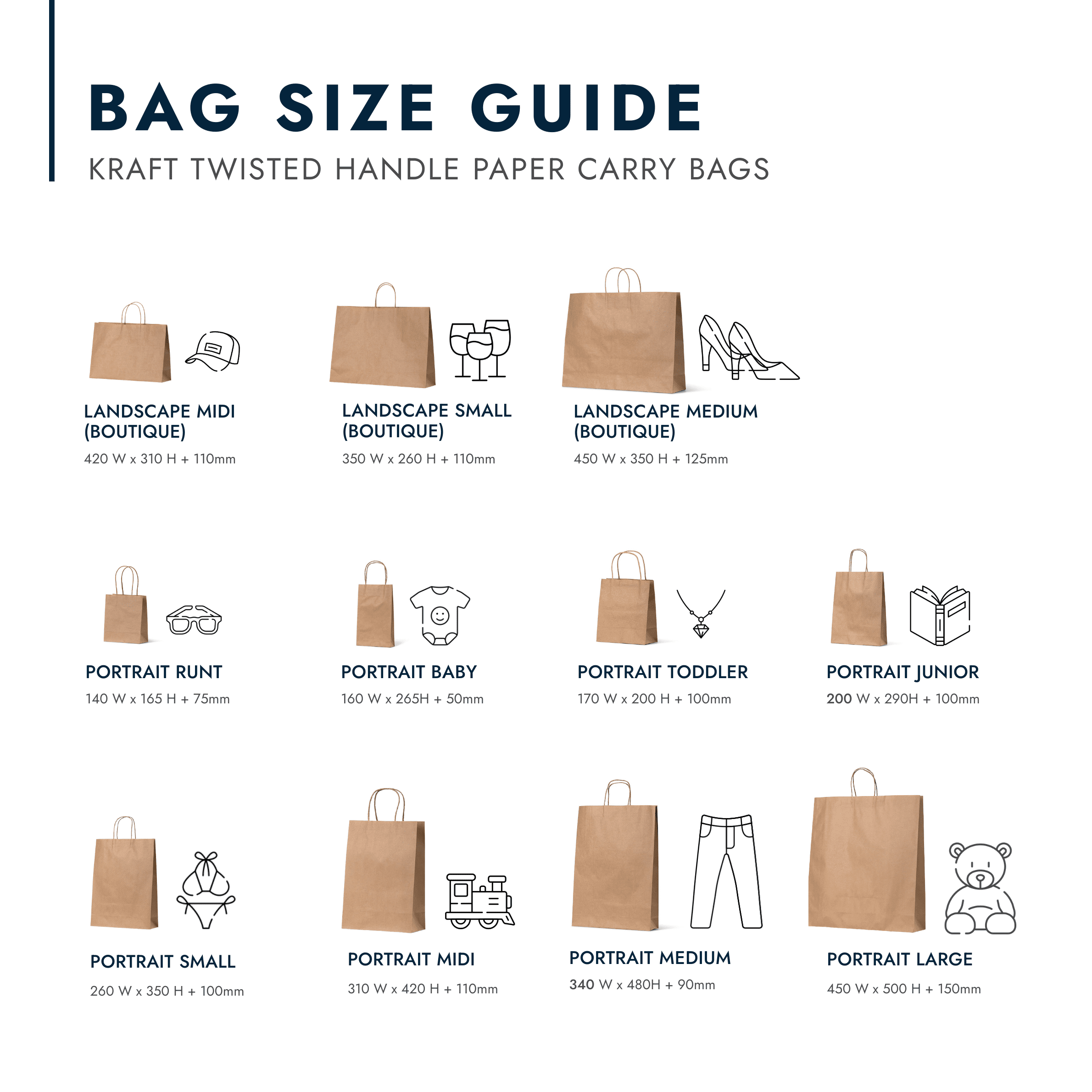 - Portrait Midi: 310mm (W) x 420mm (H) + 110mm gusset