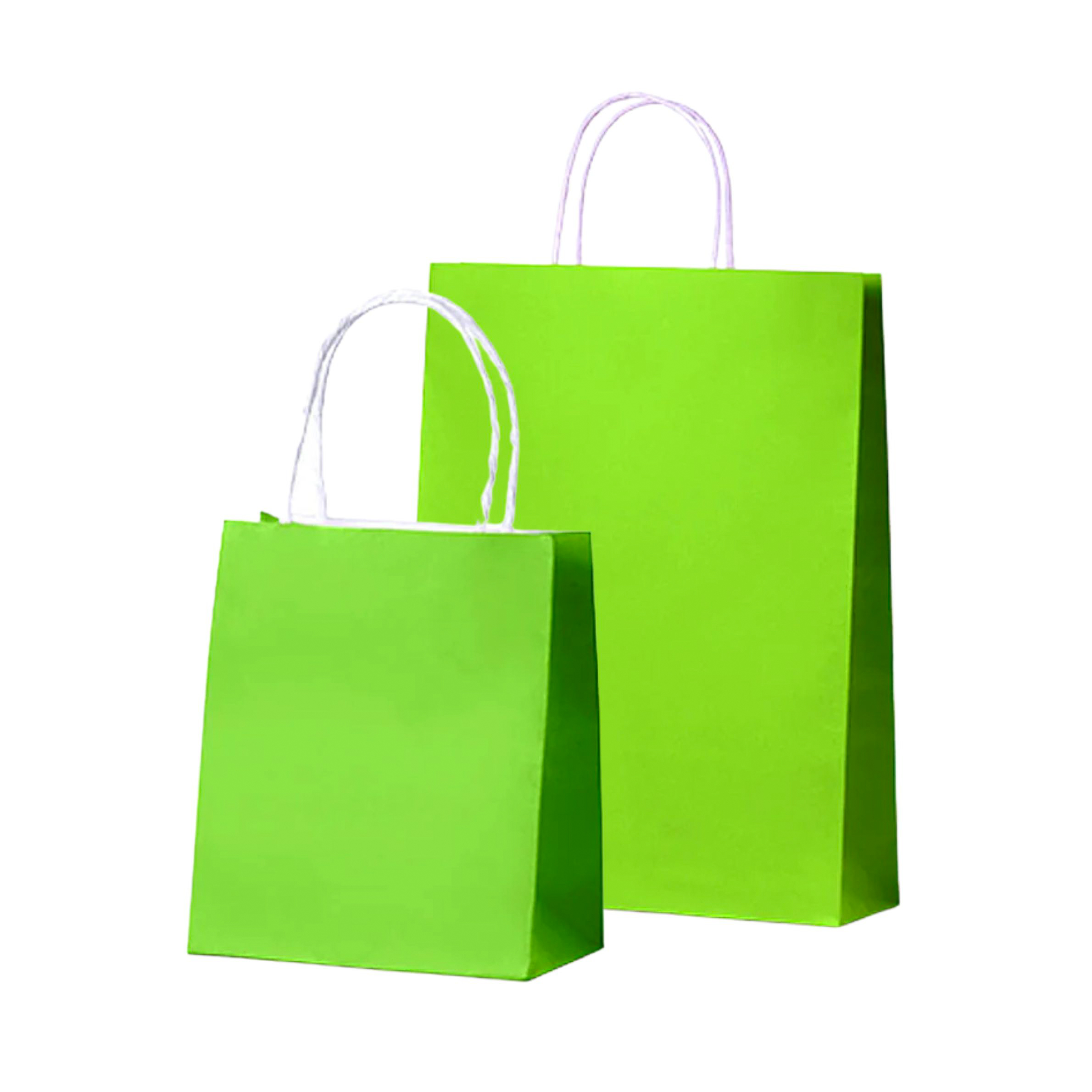 Loud Lime Green paper carry bags manufactured from 110gsm responsibly sourced kraft paper. Three size options, packed 250 per carton, with reinforced twisted paper handles.