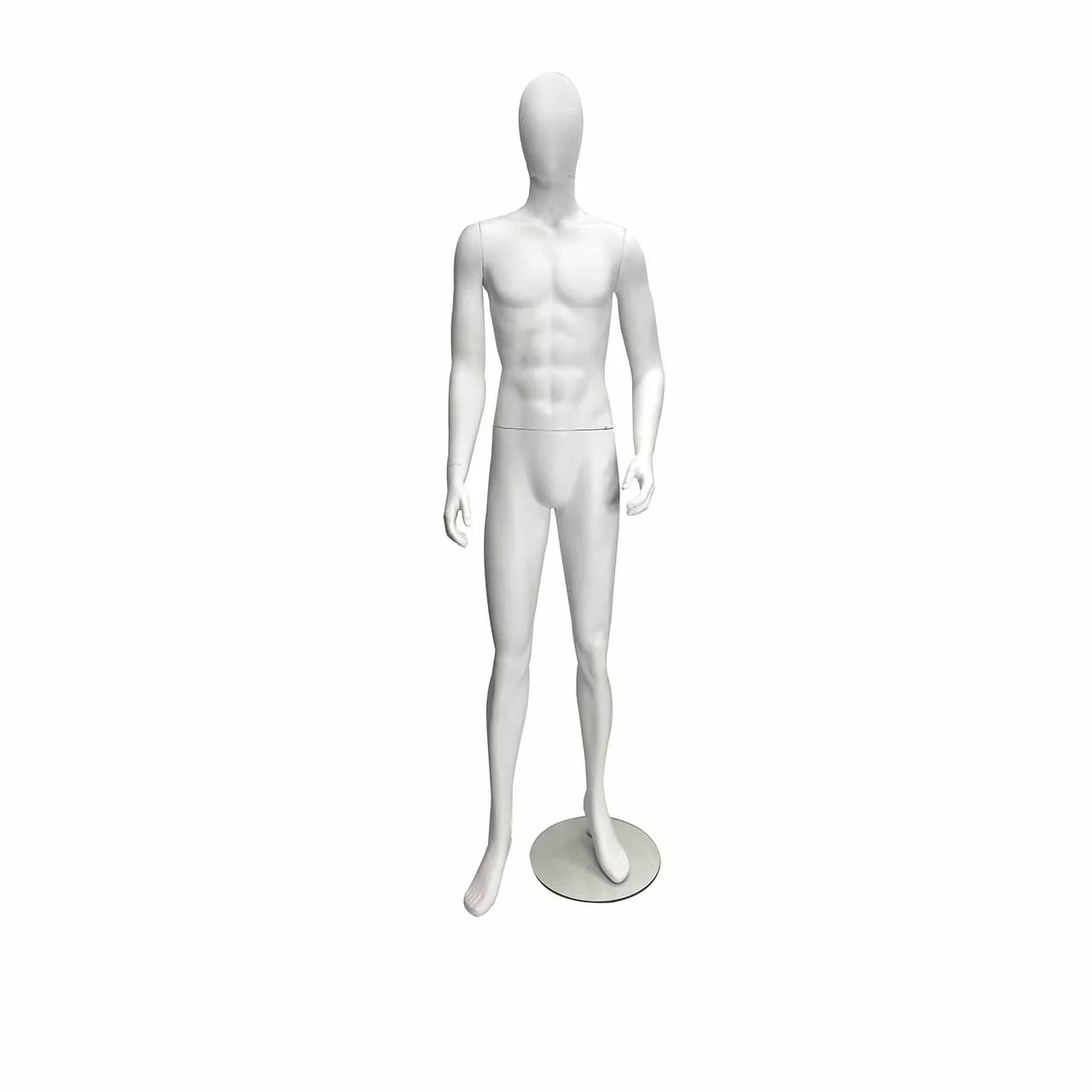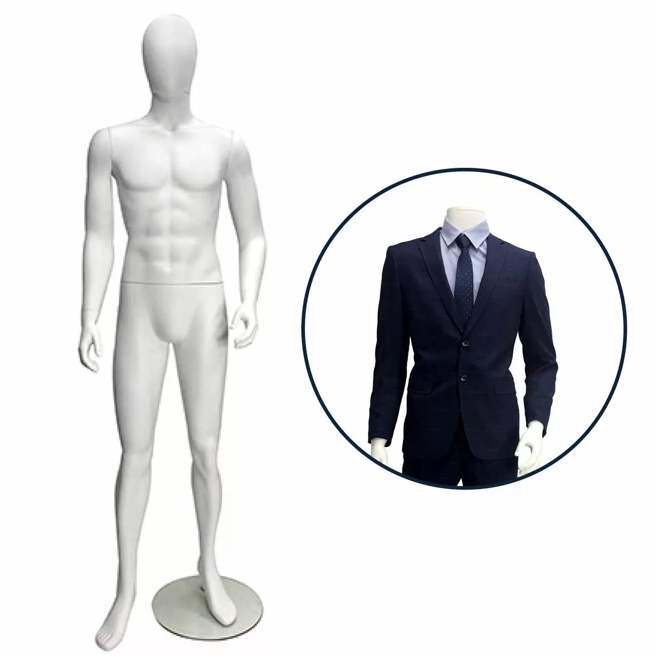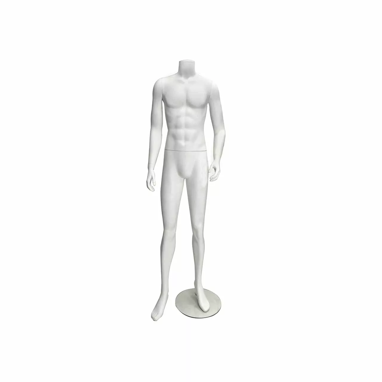 Pierre matte white male mannequin made from durable plastic polypropylene. Includes head and flat neck cap options with a glass base. Lightweight, stable and ideal for retail clothing displays.