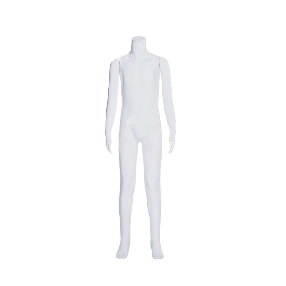 Presley 8-year-old child mannequin in matte white polypropylene. Height 1260mm, chest 640mm, waist 660mm, hips 560mm. Includes head, neck cap and glass base.