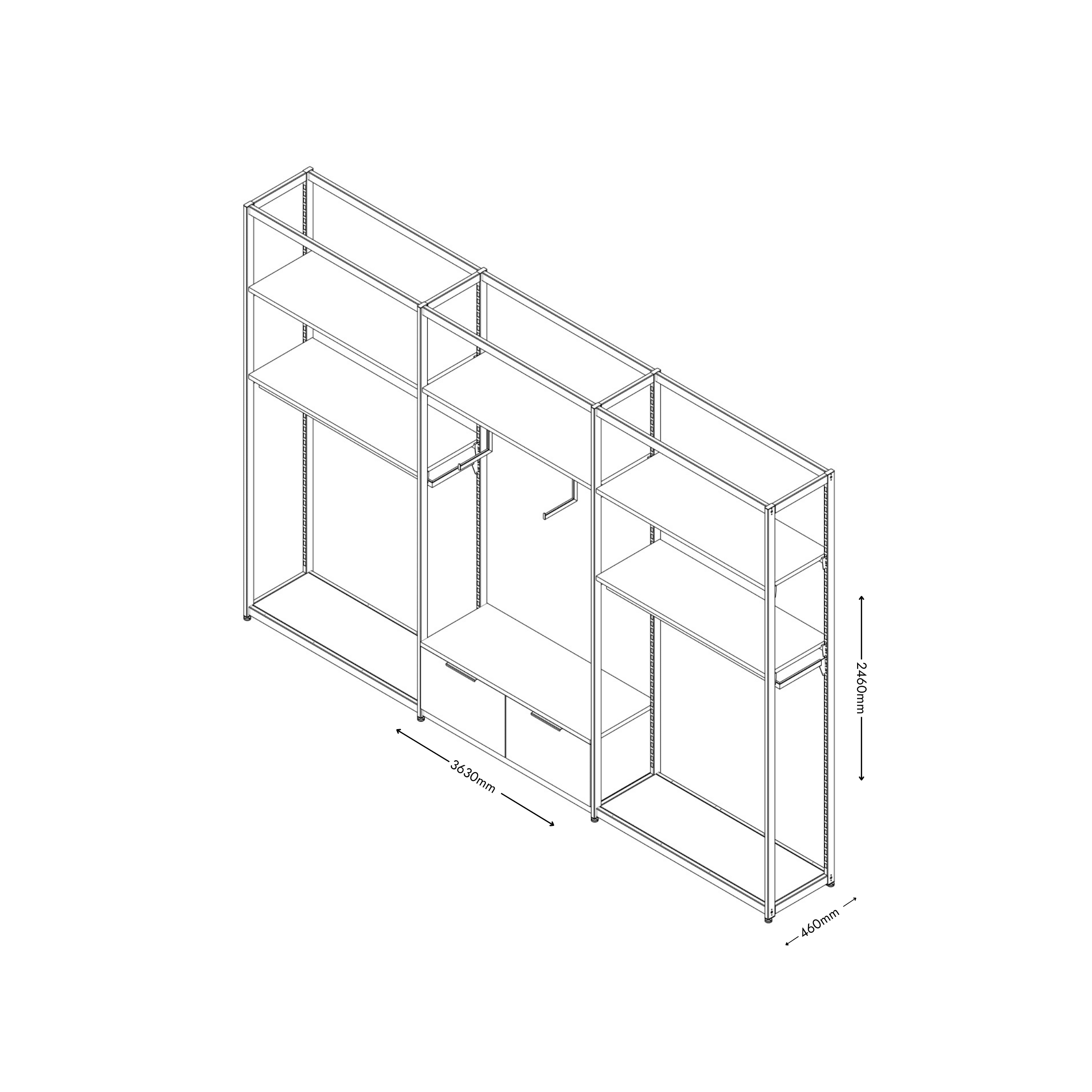 Freestanding footprint: 3630mm W x 460mm D – suitable for open-floor merchandising and against-wall placement.
